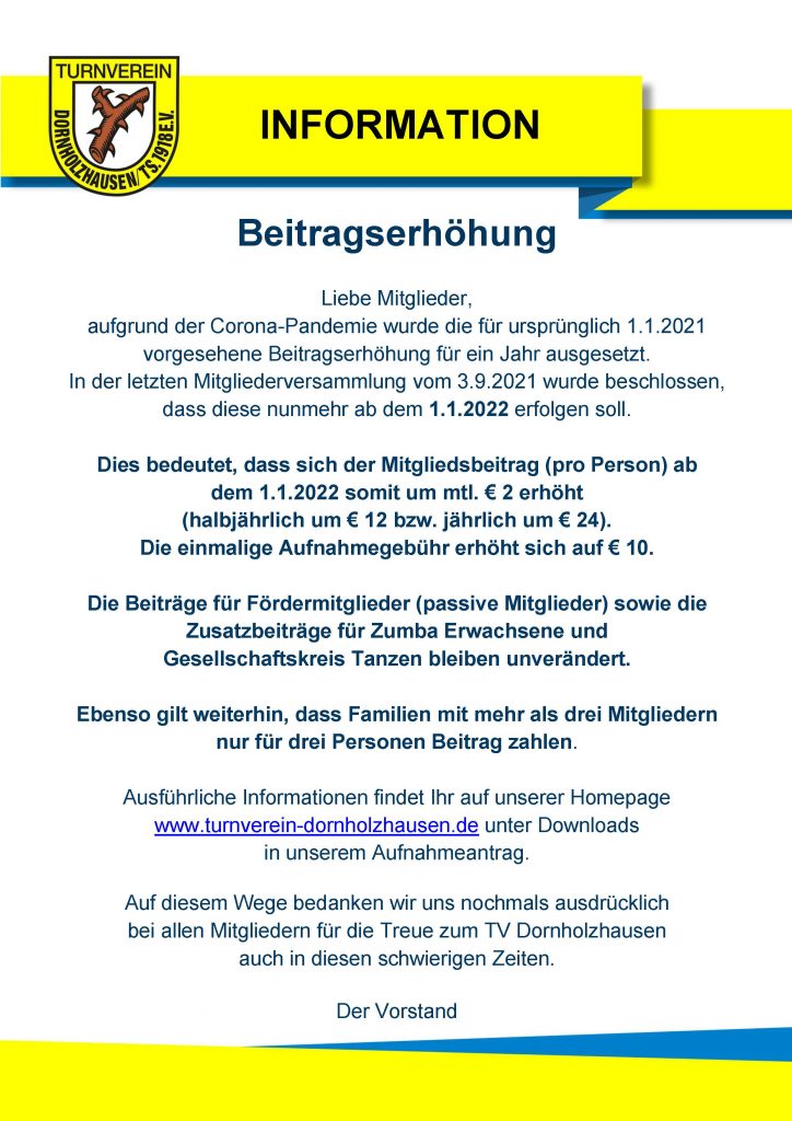 die für 2021 geplante Beitragserhöhung wurde aufgrund der Corona-Pandemie verschoben und erfolgt nun zum 01.01.2022.