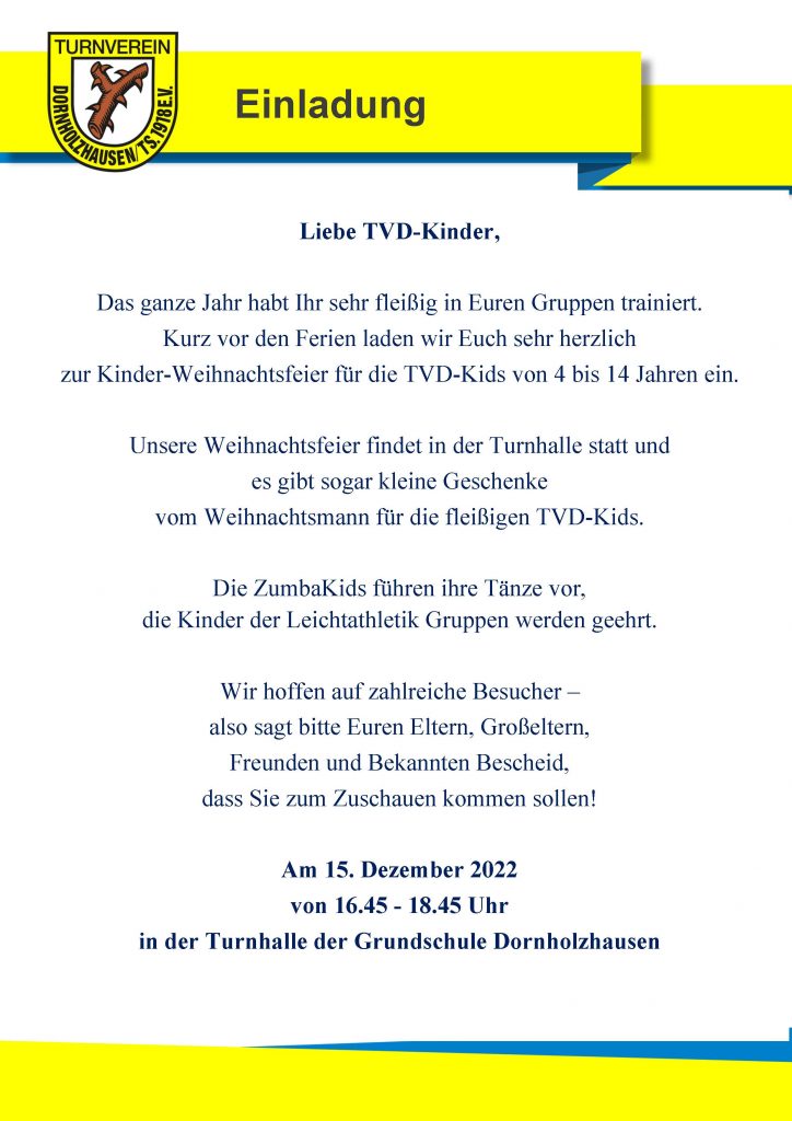 Wir laden Euch sehr herzlich zur Kinder-Weihnachtsfeier für TVD-Kids von 4 bis 14 Jahren ein.