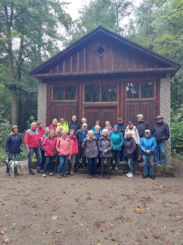 Die zweite Wanderung startete ebenfalls am Hirschgarten und führte durch den Forstgarten am Gestüt Erlenhof vorbei, über die Hardertsmühle zu den Mammutbäumen am Frankfurter Forsthaus. Die faszinierenden Bäume sind über 150 Jahre alt und stammen aus dem fernen Kalifornien. Weiter ging es dann ebenfalls zum Forellengut. Dort trafen beide Gruppen fast zeitgleich am Verpflegungspunkt ein. Deshalb konnten die letzten beiden Kilometer, am Krausbäumchen und Elisabethenstein vorbei, gemeinsam zum Endpunkt „Peter-Schall-Haus“ gewandert werden.