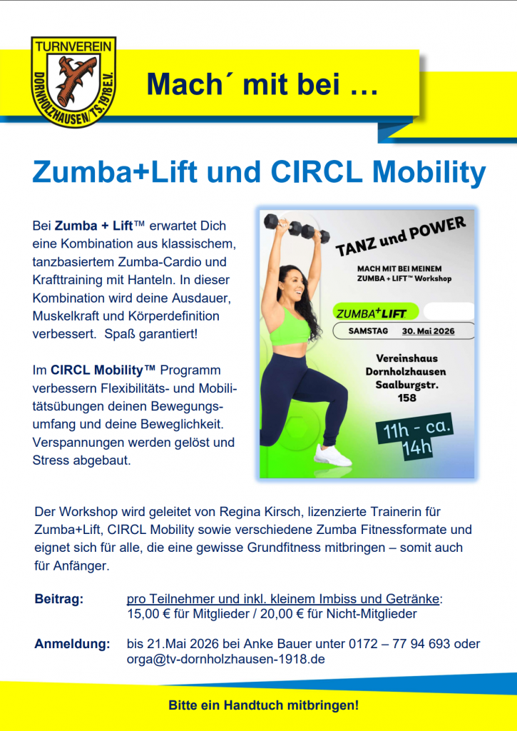 Auf dem folgenden Plakat findet Ihr eine Einladung zu unserem Workshop „Zumba+Lift™ und CIRCL Mobility™“ am 30.05.2026. Hierzu sind auch Nichtmitglieder herzlich eingeladen.