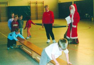 Der Nikolaus schaut beim Kinderturnen mit Renate Mengel im Jahre 2003 zu.